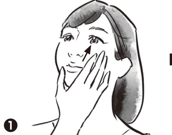 両手で両目を覆い、軽く押しつけたらやさしく上下に揺らす。それに合わせて眼球を2~3回上下に動かす。顔は正面のままで。
