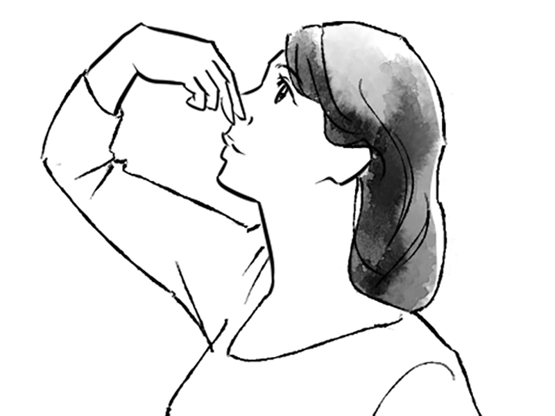 (1)右手で鼻をつまんで持ち上げ、上を向く。