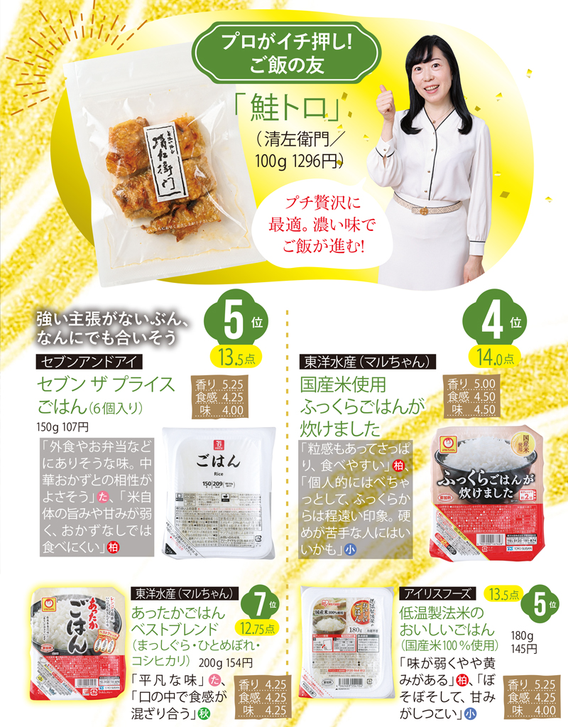 「粘りと硬さ、粒立ち、甘み、旨みどれも高レベル! 炊飯器で炊いた状態を忠実に再現。必ずほぐしてから食べて!」(たにりり)、「ひと口味わっただけで旨い米だとわかる。しっとり系の濃いめのおかずと合いそう」(小池)