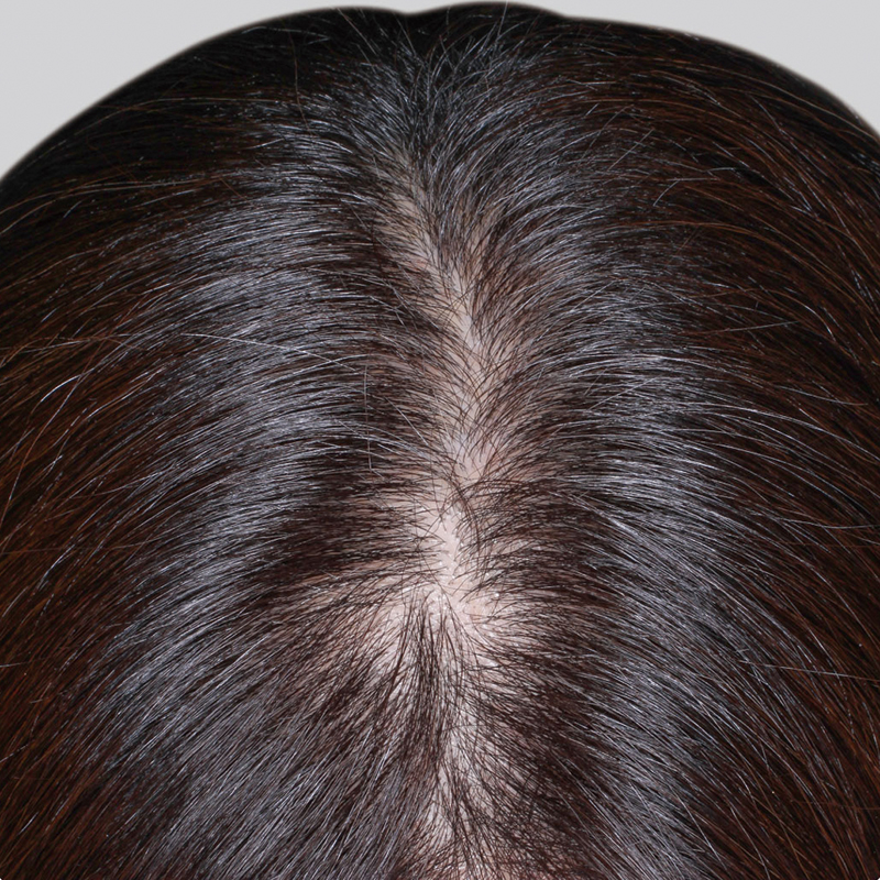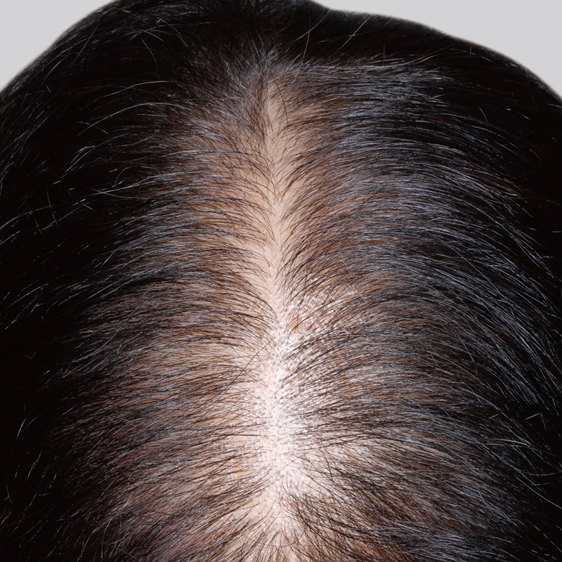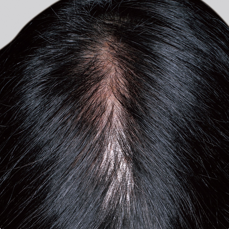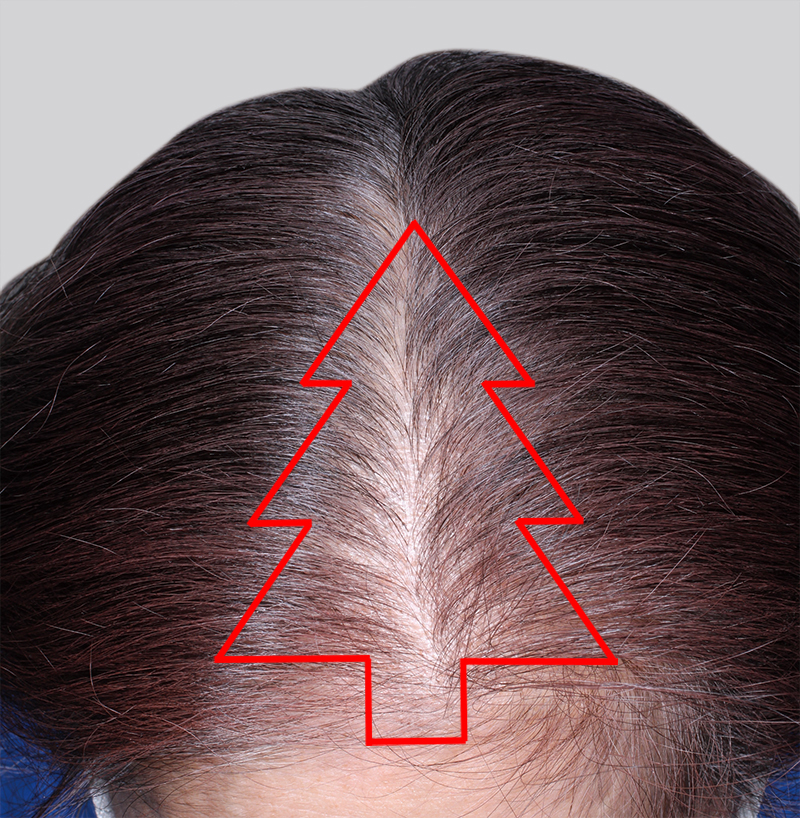 太さには個人差がありますが、日本人の平均70〜80マイクロメートルに対して40マイクロメートル未満の毛、つまり軟毛が増えてきます。女性の場合、分け目周辺から広範囲に髪が少しずつ薄くなるため気づきにくく、頭頂部が三角形に脱毛するクリスマスツリー型になるケースもあります」