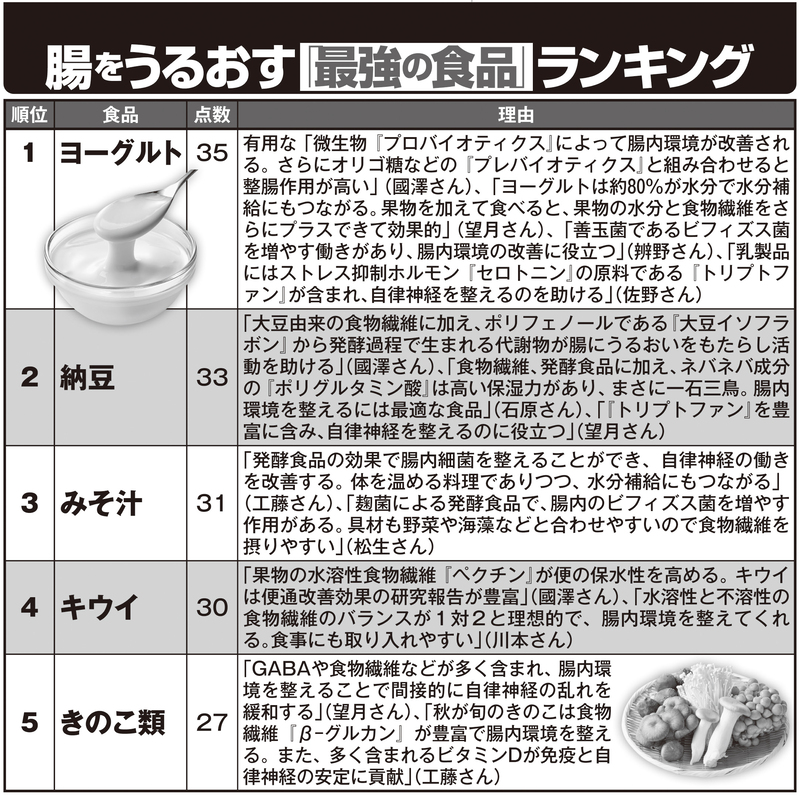 「大豆製品のみそには、必須アミノ酸の『トリプトファン』が多く含まれている。リラックス作用がある『セロトニン』の原料となるため、自律神経を整えて腸の動きを活発化させます。発酵食品なので腸内環境の改善も期待できる。水分も摂取できるみそ汁は、これから寒くなる季節におすすめです」(医学博士の佐野こころさん)