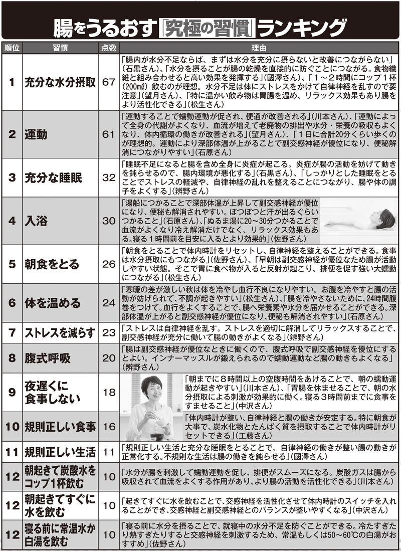 日々の習慣も大事になる。ダントツは「充分な水分摂取」だ。消化器内科専門医の工藤あきさんが言う。