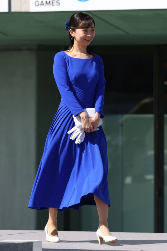 ブルーインパルスの一糸乱れぬ隊列に拍手を送られた佳子さまは、滋賀県にある琵琶湖を意識されたのか、ワンピースから髪飾りまで全身鮮やかなロイヤルブルーで統一された“琵琶湖コーデ”に身を包まれていた。なかでも注目を集めたのが、胸元から腰まわりまでのプリーツが印象的なワンピースだった。