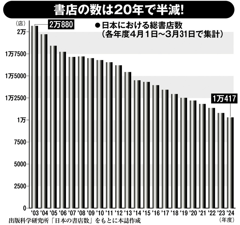 日販の「出版物販売額の実態2024」によると、2006年度に1万4555店だった書店店舗数は2023年度に7619店まで激減した。地域に書店がひとつもない「無書店自治体」が2024年11月で3割近くに達するとのデータもある。