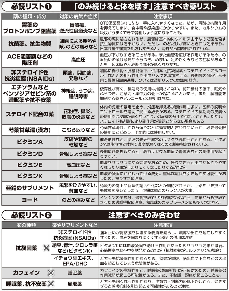 とりあえず処方されがちな鎮痛剤や胃薬、風邪に効かない抗生物質、腎機能悪化の恐れがある降圧剤と鎮痛剤の併用…「のみ続けると体に悪い薬」「のみ合わせに注意すべき薬」リスト